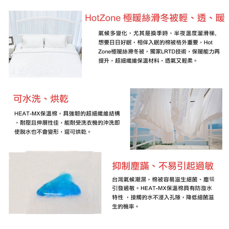 由於台灣氣候潮濕,棉被容易滋生細菌、塵蟎,而引發呼吸道過敏,HEAT-MX保溫棉不含蛋白質成分,具有不吸濕、快乾的特性,可以定期清洗,去除各式過敏原,最適合過敏體質者使用。