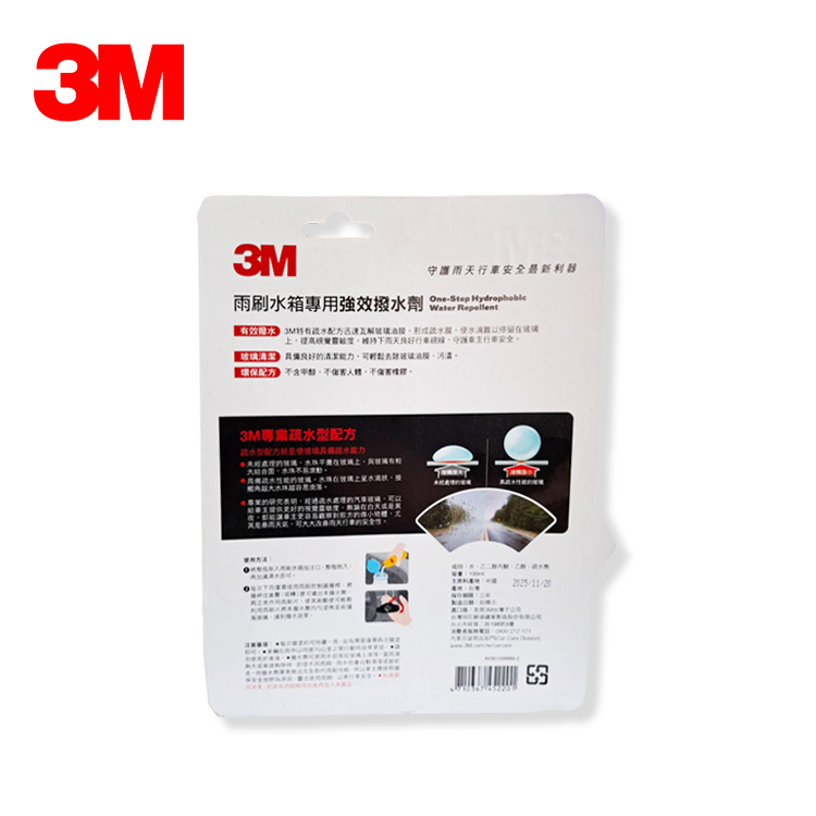 1. 有效撥水:3M特有疏水配方迅速瓦解玻璃油膜,形成疏水膜,使水滴難以停留在玻璃上,提高視覺靈敏度,維持下雨天良好行車視線,守護車主行車安全。