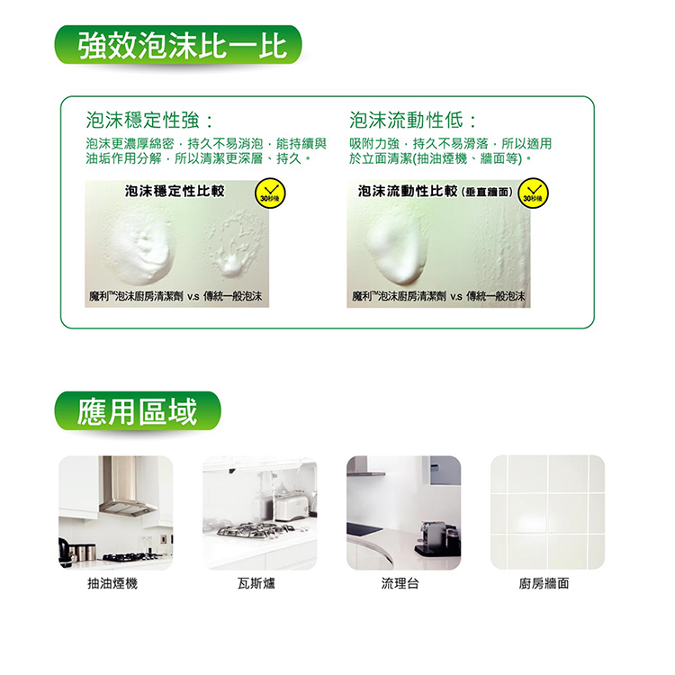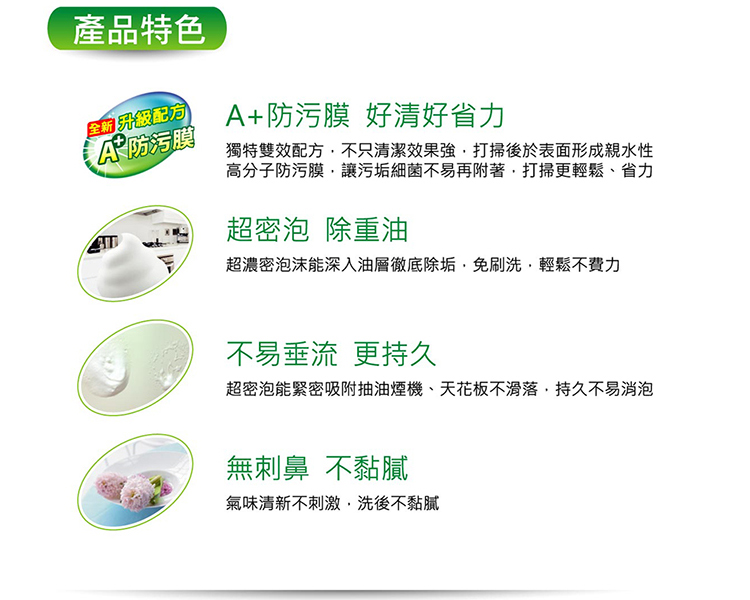 ◆不垂流,更持久:超密泡能緊密吸附抽油煙機、天花板不易滑落,持久不易消泡。