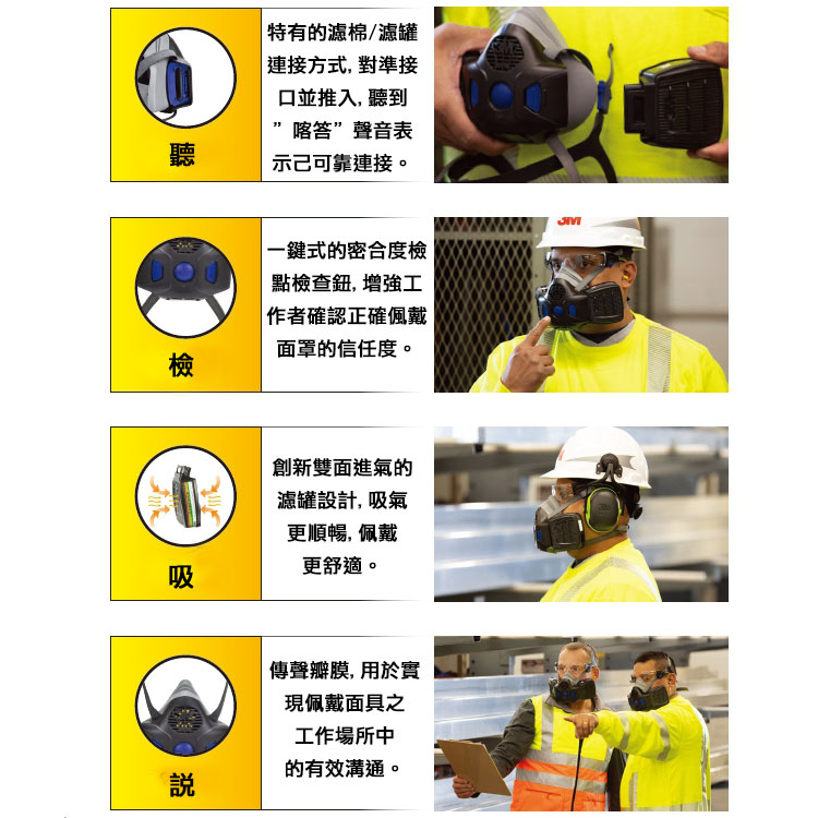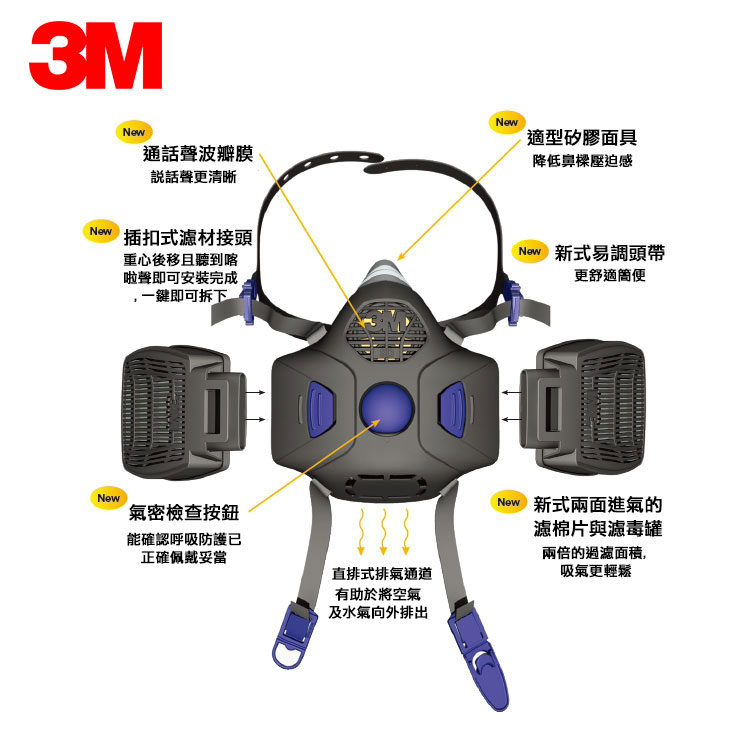 3M-HF-800系列半面體雙罐式防毒面具本體為舒適、耐用及穩定、輕量結構的矽膠材質製成。
