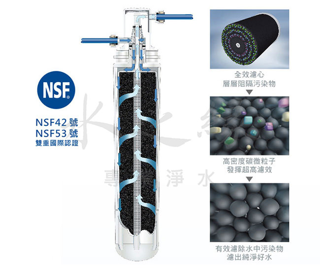 ◆ 通過NSF42號、53號認證,可有效去除水中餘氯、異味、鐵鏽及雜質;可去除水中99.95%孢子孢囊有害微生物