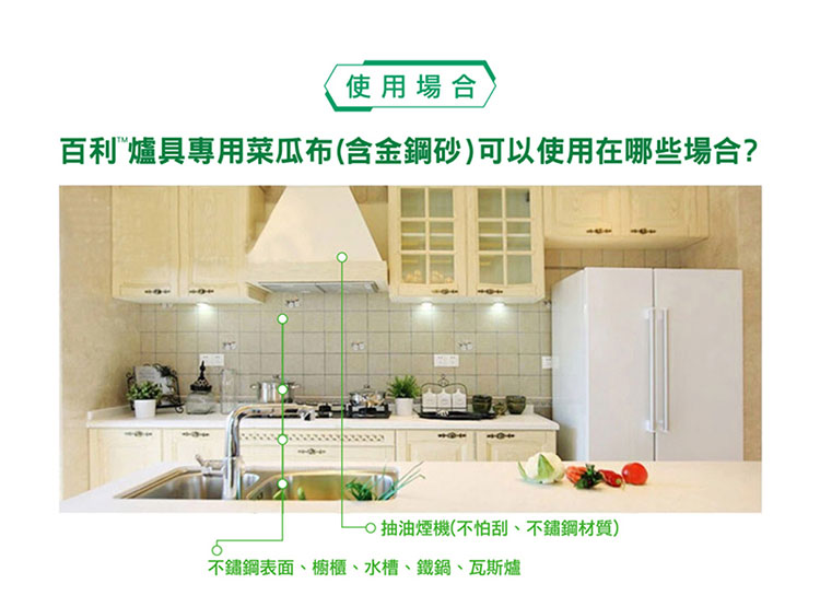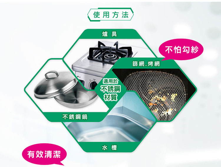 ◆適用於清潔鐵、不銹鋼等材質之爐具、鍋具等污垢。