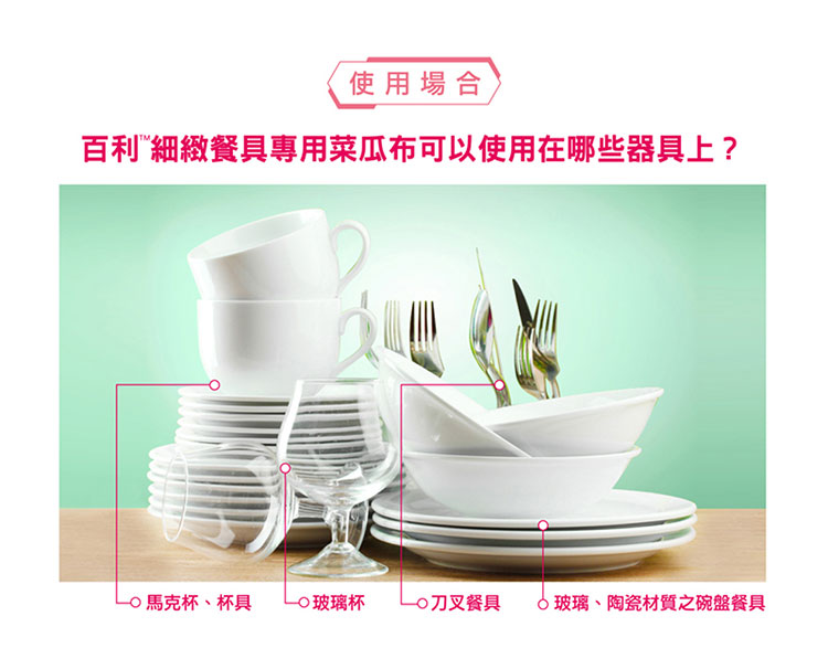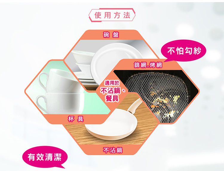 ◆適合於清潔陶瓷、玻璃等材質之餐具與茶杯與不沾鍋等輕度污垢。