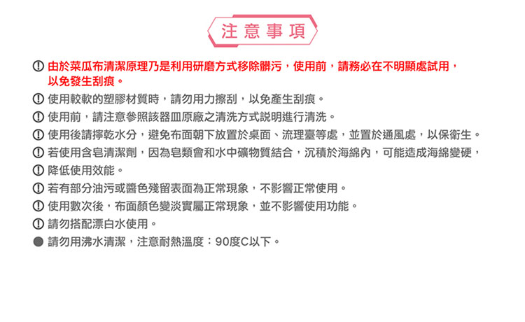 ◆整體菜瓜布柔軟彈性可隨器皿形狀彎曲,深入餐具邊邊角角與茶杯底部,可輕鬆清潔污垢與茶垢。