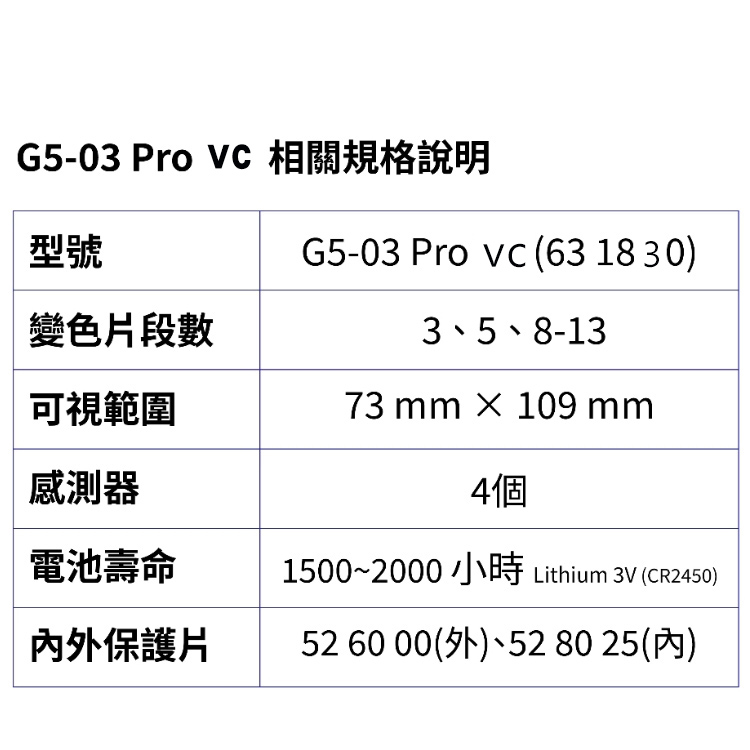 遮光度:3、5、8-14 (VC款)/2.5、5、8-13(TW款)