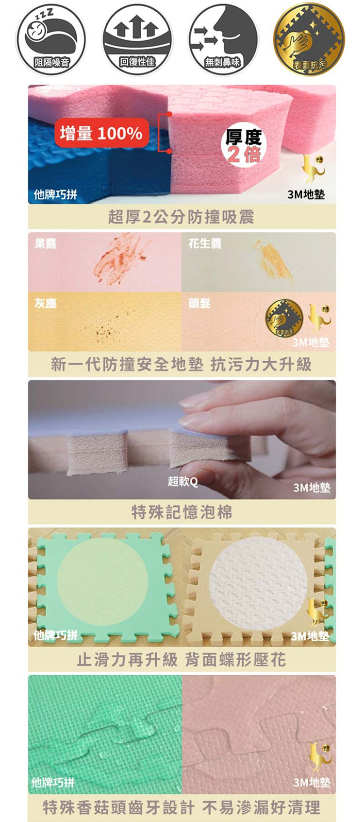 ◆創新的Puzzlemat地墊,有特製的柔軟緩衝層,在8.5KG的撞擊力下,相較於市面一般EVA地墊,有4.2倍的吸震效果,可讓寶寶更安全。