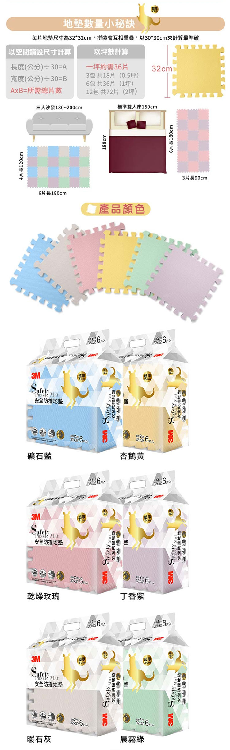 3M 新升級兒童安全防撞地墊32cm-杏鵝黃 6片