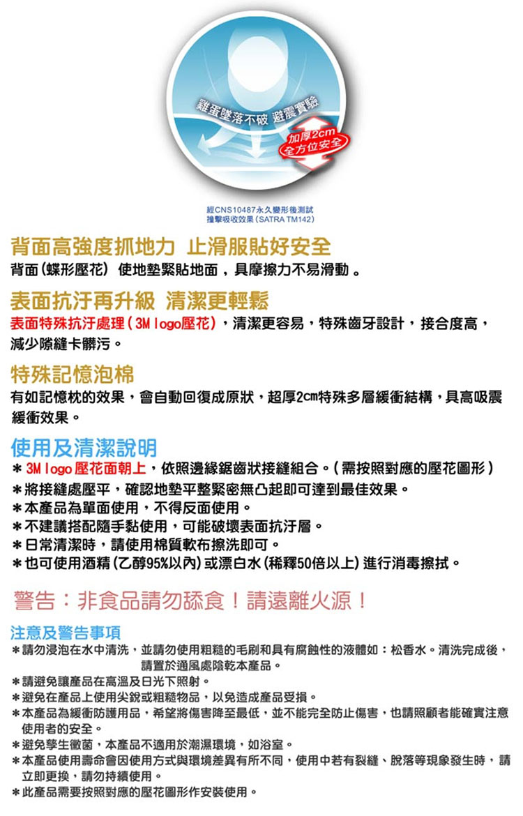 ◆地墊緊貼地面,具磨擦力因此不易滑動,避免學步期的幼兒滑倒,保障孩子的安全。