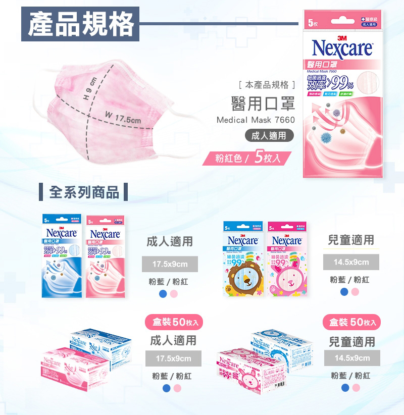 3M醫用口罩 / 粉色 5枚一包 10包為一盒