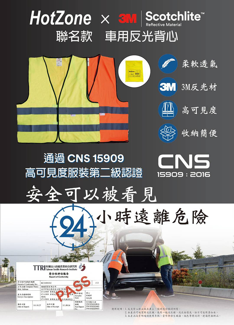 HotZone x 3M CT15909 車用反光背心 螢黃 螢橘 Scotchlite 通過 CNS15909 認證